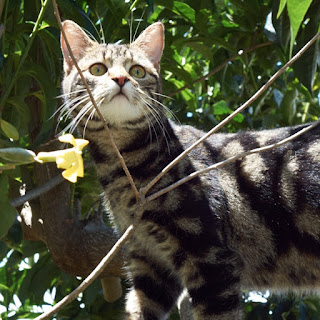 Hey Stanley, move along, we have our own tree cat now so don't overrate yourself. Our little Hobie (that is not so little any more) proves herself to be a real tree cat. Whenever we have coffee or tea on the deck, she will follow and into the garden. Next minute, we will see her little face in the ti tree meowing at us. She also likes the Australian frangipani; that one has bigger branches and she can easily jump up and down on to the fence. We are glad we adopted her and give her a happy home.